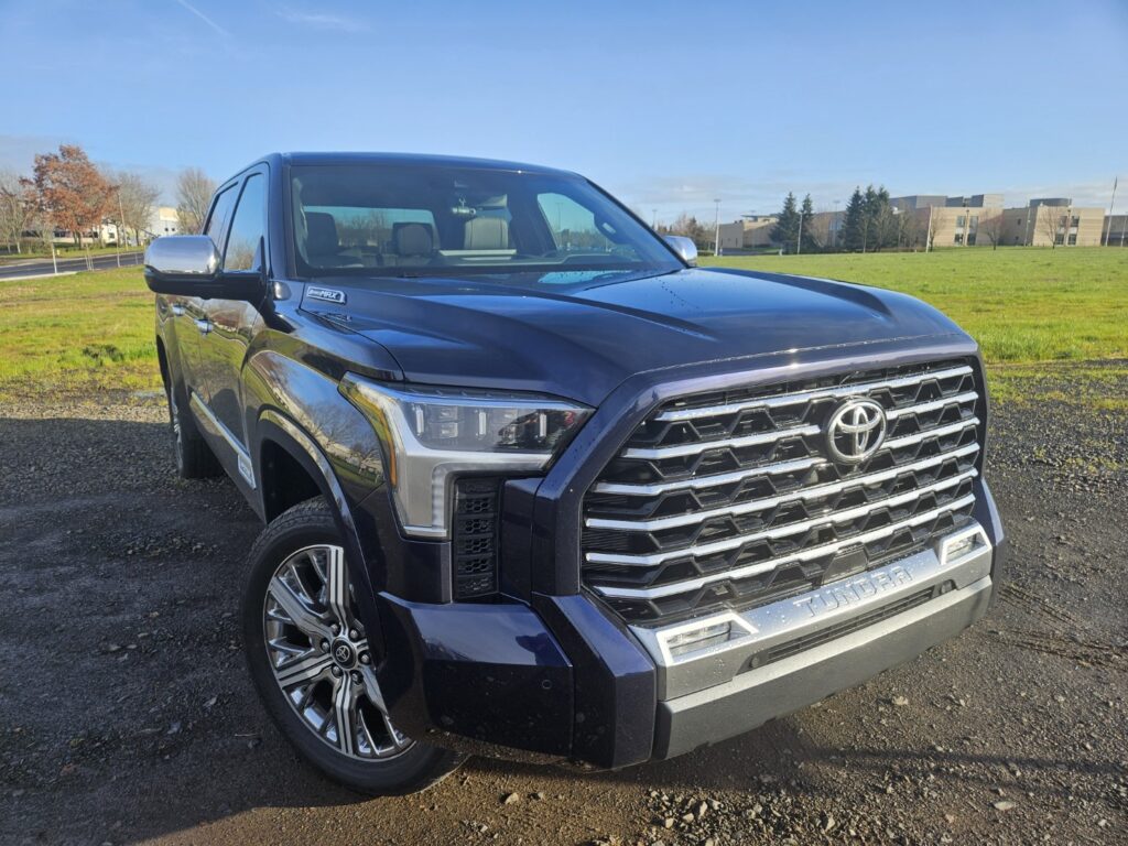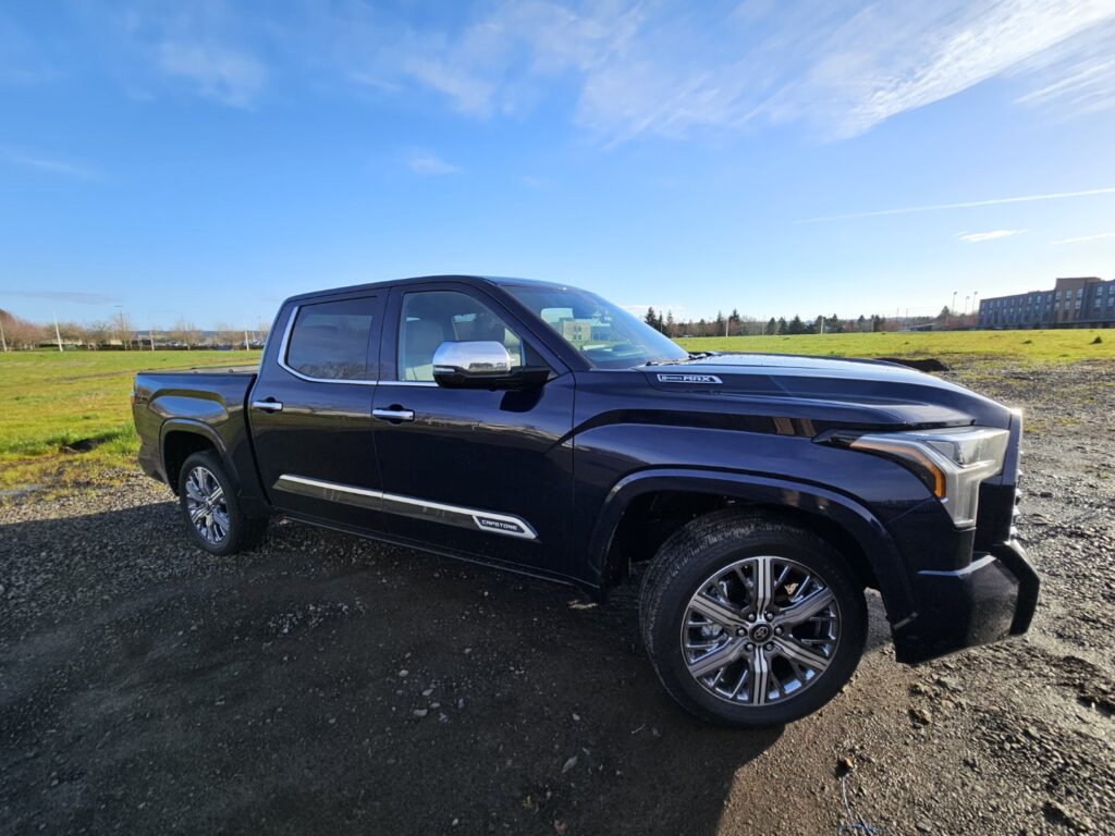 El acabado Capstone de nuestra prueba viene exclusivamente con el tren motriz híbrido i-Force Max. Esta configuración es adecuada para un desplazamiento a baja velocidad totalmente eléctrico, y si algo no falta aquí es potencia. En cualquier situación, la Tundra se siente ágil y la potencia permite a este lujoso vehículo de carga realizar tareas propias de un camión, tales como remolcar hasta 10.290 libras y transportar una carga útil de 1.420 libras, lo que equivale a 4.667 y 644 kilogramos, respectivamente.