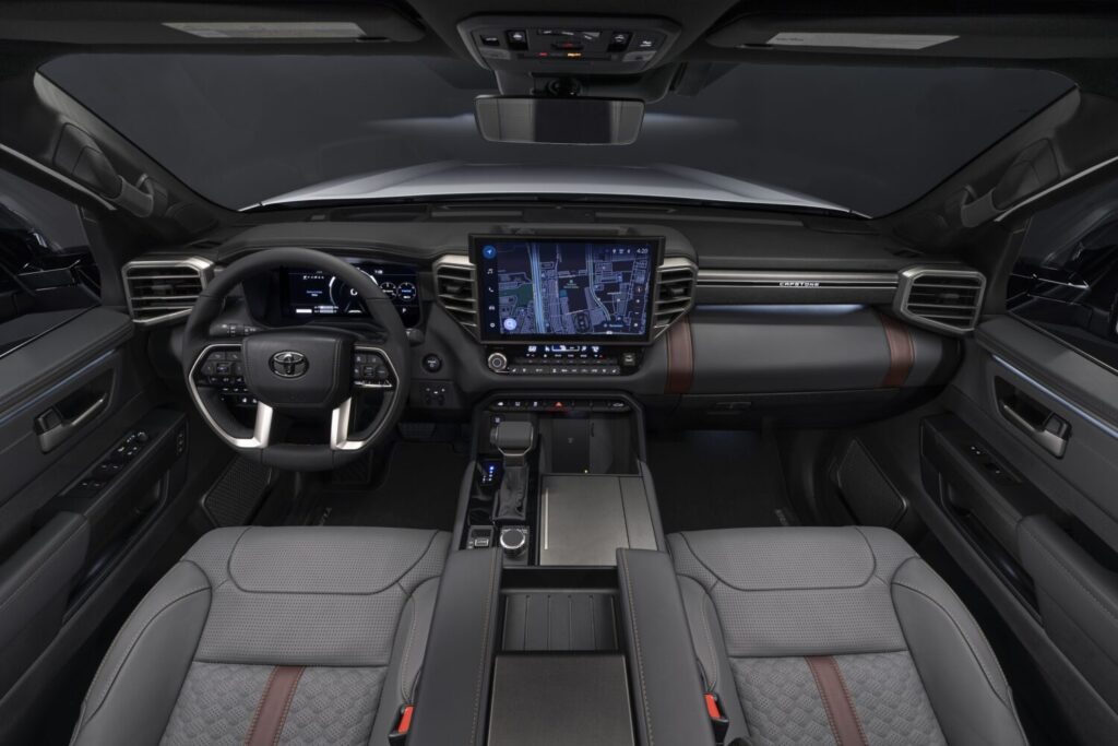El acabado Capstone incluye una pantalla de proyección o HUD a color de 12 pulgadas y un espejo retrovisor digital, así como el asistente de voz inteligente integrado con la funcionalidad “Hey Toyota” para dictar direcciones de navegación, cambiar de estación de radio o ajustar la temperatura de la cabina. Y como todas las Tundras, la Capstone obtiene la suite de características de seguridad activa de Toyota, incluyendo luces altas automáticas, control de crucero adaptable, mantenimiento de carril con centrado activo de carril y frenado de emergencia automático.
