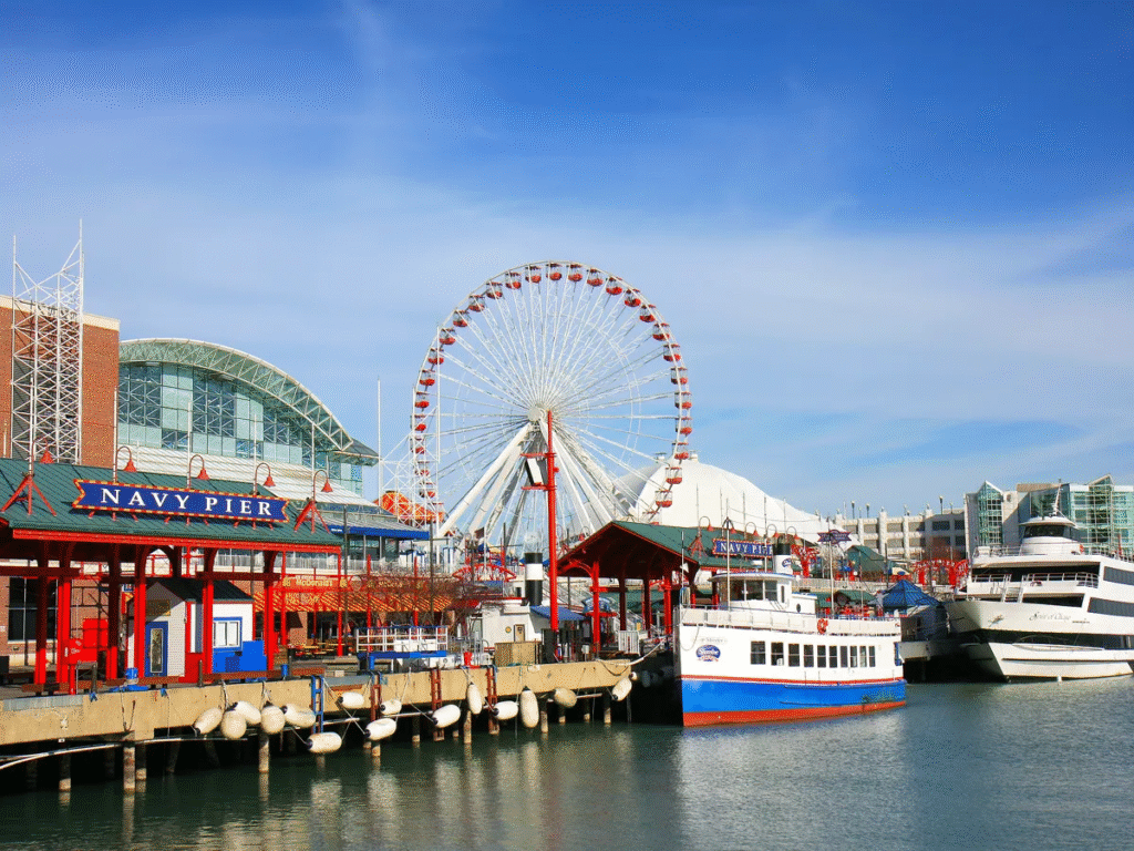 The pier’s position, at the mouth of the Chicago River near the city’s downtown area and the museums along the lakefront, made it attractive to developers. In 1995, they transformed the 50-acre site into the amusement and entertainment hub that it is today. Navy Pier’s distinctive profile — with an enormous 196-foot Ferris wheel, the merrily lit and tilting mushroom top of a swing chair ride, and the pointed and striped canopy of a carousel — lends an air of playfulness to the city’s imposing skyline.