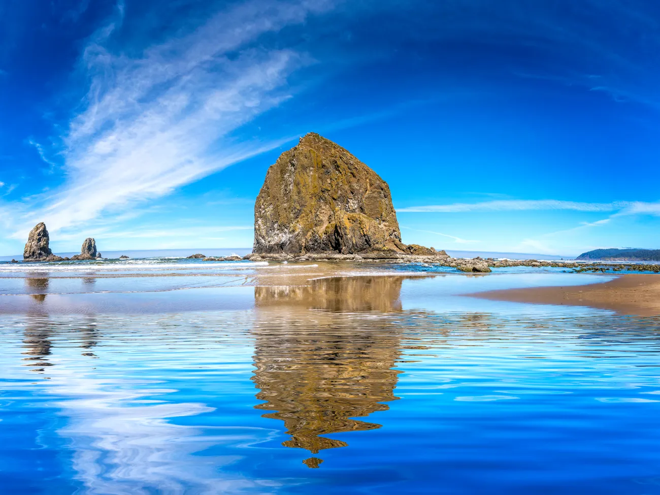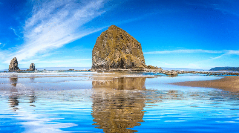 Fans of the 1985 film The Goonies will likely recognize Oregon’s Cannon Beach and its shimmering sand that beckons visitors toward a 235-foot-high sea stack, aptly named Haystack Rock. The towering basalt rock and its three smaller neighbors — nicknamed the Needles — are by-products of lava that settled in the Pacific Ocean approximately 17 million years ago, then surfaced due to plate tectonics and sea level changes.