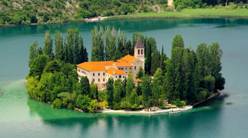 Visovac Monastery (pronounced “vee-so-vatz”) is located in the middle of a river in Croatia’s Krka National Park. The monastery is situated on a small, oval-shaped island ringed by cypress trees. It dates to the 14th century when Augustinian monks constructed a church on the island. Later, in 1445, a group of Franciscan monks fled Bosnia, took over the monastery, and enlarged it.