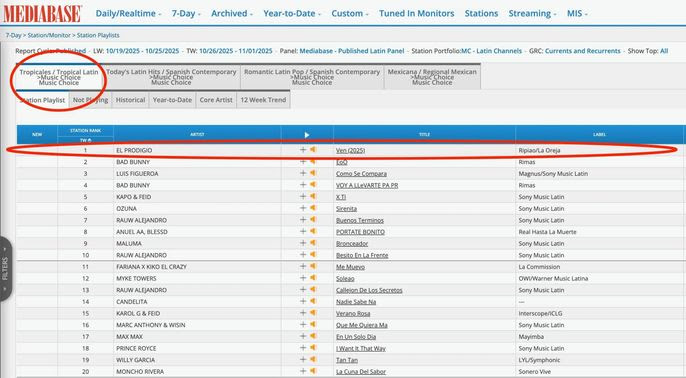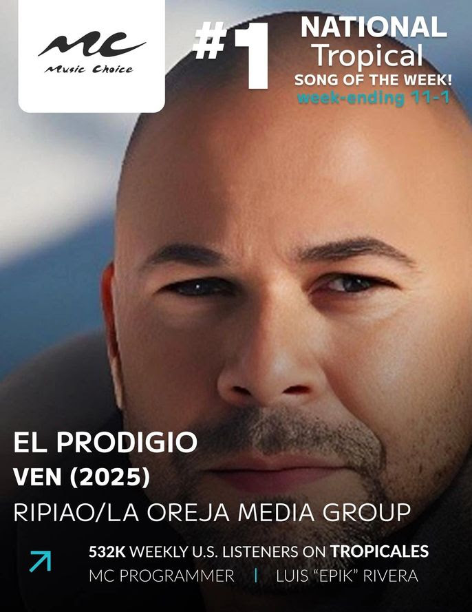 Miami, FL, 11 de noviembre de 2025.- (@MinayaPR) El inigualable acordeonista y exponente del merengue típico El Prodigio continúa consolidando su carrera internacional al alcanzar el puesto #1 en la lista “National Tropical Song of the Week” de Music Choice USA con su más reciente éxito “Ven”, lanzado bajo la distribución de La Oreja Media Group.