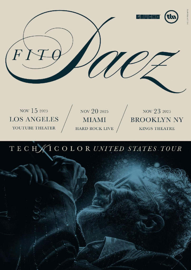 Fito’s fans will have the opportunity to celebrate NOVELA‘s double Latin GRAMMY® win during the “Páez Tecknicolor USA’25” tour, which will see the Argentine superstar visiting Los Angeles (November 15, YouTube Theater), Miami (November 20, Hard Rock Live), and Brooklyn, New York (November 23, Kings Theatre)—tickets on sale at www.fitopaezoficial.com/conciertos/.