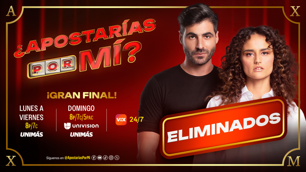 La gran final de “¿Apostarías por mí?”, conducido por Alejandra Espinoza y Alan Tacher, será este domingo 15 de marzo a las 8 p.m. Este / 7 p.m. Centro / 5 p.m. Pacifico por Univision y UNIMÁS, en simultáneo en EE. UU. y en las estrellas en México. La experiencia completa 24/7 está disponible en ViX. Los detalles de horario para cada país los pueden consultar en las redes sociales en @ApostariasPorMi y @ViX.