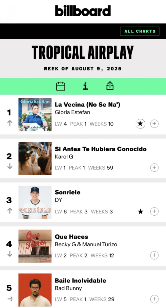 en la lista “Tropical Airplay” de Billboard, reafirmando su legado musical