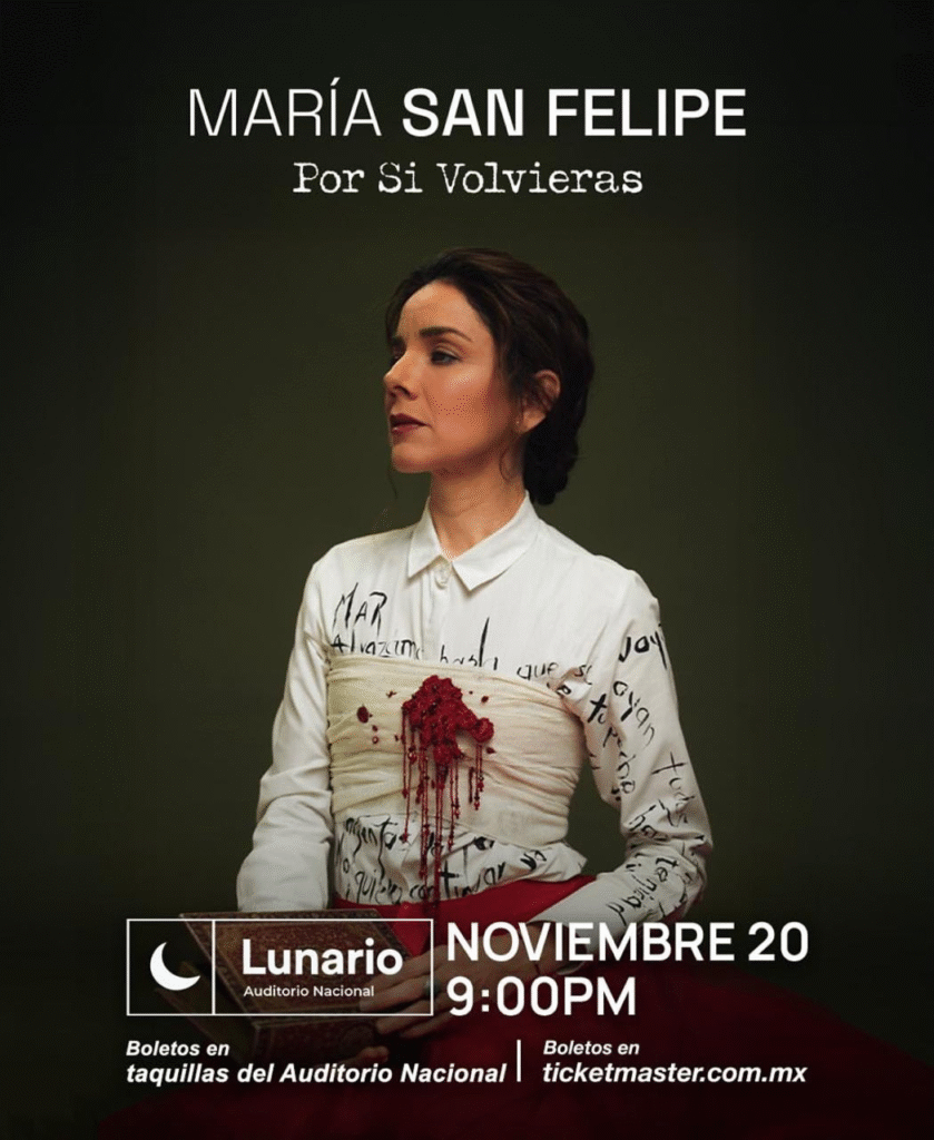 Ciudad de México, 9 de agosto de 2025 — La cantautora y poeta María San Felipe se presentará por primera vez en el Lunario del Auditorio Nacional el próximo 20 de noviembre a las 21:00 hrs, con su espectáculo “Por si volvieras”, una propuesta escénica profundamente íntima que entrelaza música, poesía y emociones al desnudo.