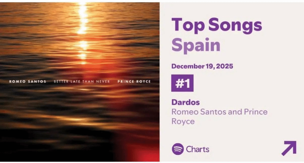 (27 de enero de 2026) – Romeo Santos y Prince Royce alcanzan un nuevo éxito internacional con la canción “Dardos”, certificada Disco de Oro en España y actualmente ubicada en el puesto #1 del Top Songs de Spotify en ese territorio.