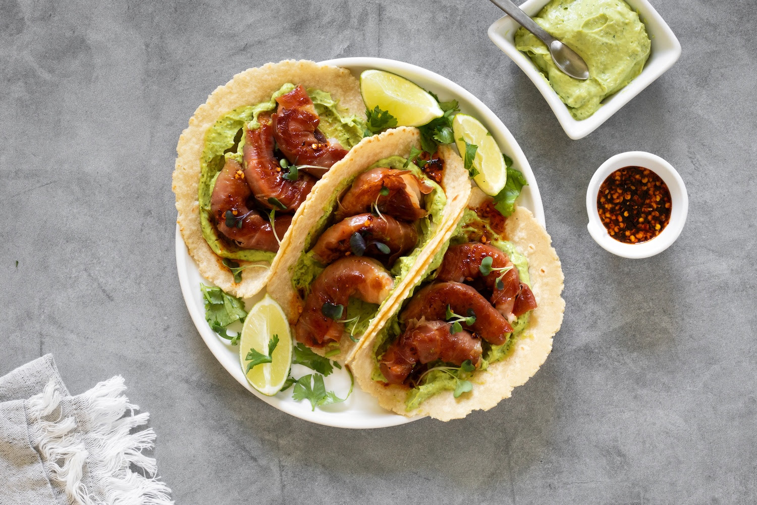 For the avocado sauce, blend the avocado, yogurt, cilantro, garlic, lime juice, and salt until smooth and creamy. Refrigerate. For the macha honey, mix the honey with the macha sauce until fully combined. Adjust the spice level to keep the pairing balanced, then set aside. Wrap each shrimp with a slice of ham and sear in a skillet with a little olive oil for 2–3 minutes per side, until the ham is golden and crispy. To assemble the tacos, warm the tortillas, spread a layer of avocado sauce, add three shrimp, drizzle with macha honey, and top with microgreens. Serve and enjoy!