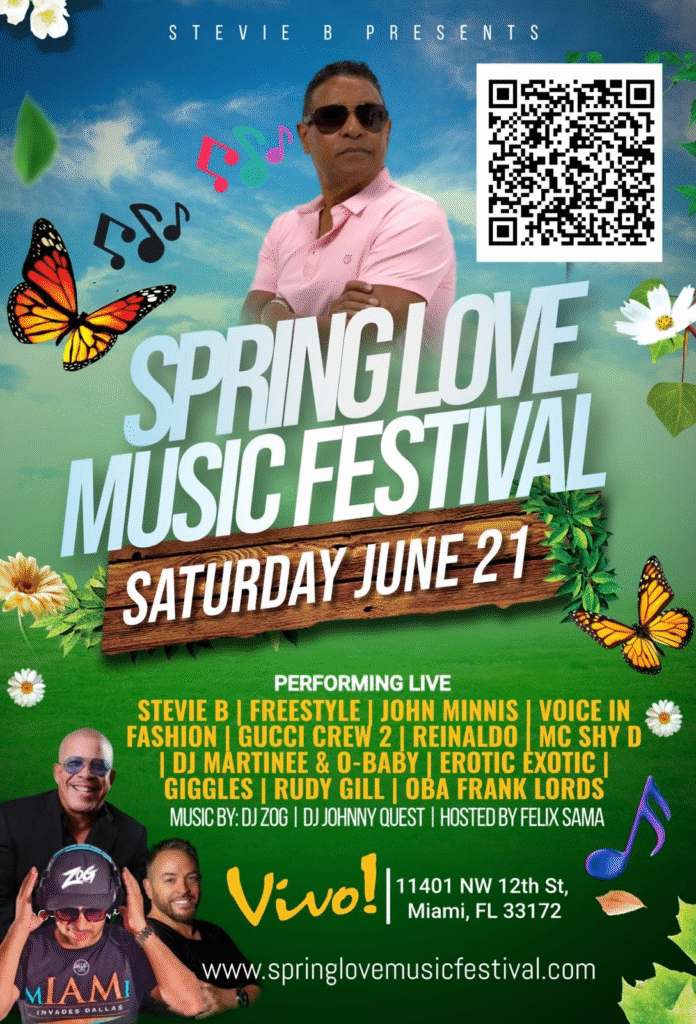 Miami, FL – [junio de 2025] — ¡Prepárate, Miami! Stevie B encenderá el verano con el Spring Love Music Festival, que se celebrará el sábado 21 de junio de 2025 en VIVO! Dolphin Mall. Este evento musical de alta energía reunirá a fanáticos de toda la región para una celebración épica del freestyle, el bass y los ritmos old-school.