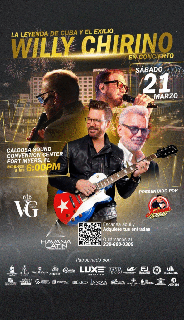 MIAMI, FL. (9 de febrero de 2026) El icónico cantante y compositor cubano Willy Chirino llegará a Fort Myers el sábado 21 de marzo de 2026 para celebrar cinco décadas de trayectoria artística en un concierto sin precedentes en el Caloosa Sound Convention Center. Conocido por éxitos como “Medias Negras”, “Nuestro Día (Ya Viene Llegando)” y “La Noche Perfecta (Remix)”, Chirino ofrecerá una noche cargada de salsa, emoción y orgullo cultural.